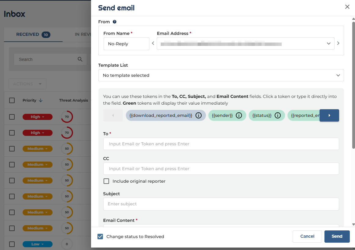 Tokens: Admins can insert dynamic tokens into the To, CC, Subject, and Email Content fields.
