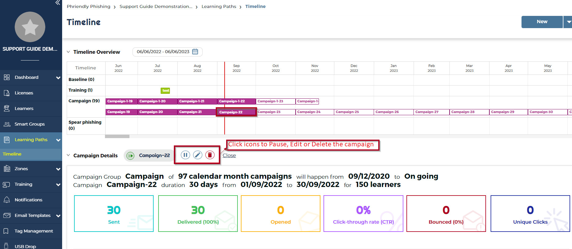 - Log into your dashboard and go to the Learning Paths tab. Select New > Campaign (a Campaign creation page will open under the timeline)
