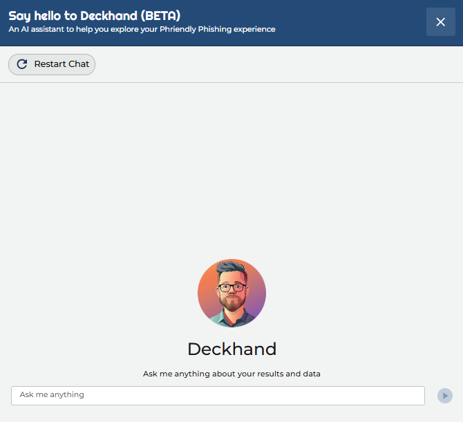 Deckhand Explorer focuses on phishing and training data available in your Phriendly Phishing reporting. It cannot answer questions about systems or data outside the platform. Treat Deckhand Explorer’s answers as an aid, not a replacement, for your existing reports. For formal reporting, always confirm key figures in the relevant dashboard.