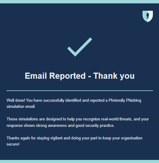 - The Microsoft phish reporter will send the emails to Phriendly Phishing and learners will be notified on the type of email (eg: Simulated phishing) via email instead of immediately getting a popup after reporting.