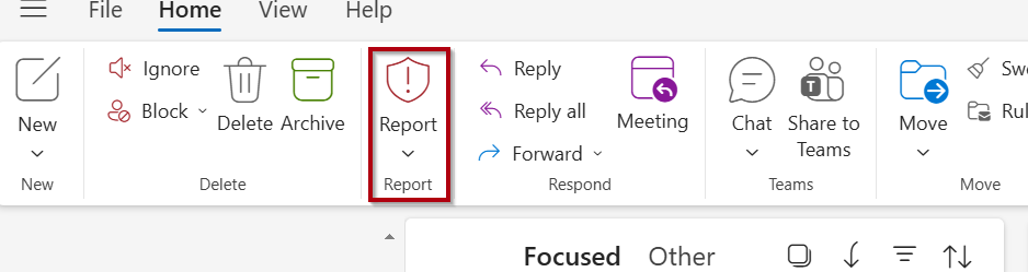 Note : This will only appear if you have enabled it in the settings. This message can also be customised for either 'Phishing' or 'Junk'. - The email will be automatically forwarded to the security email and moved to the Deleted email folder in Outlook.